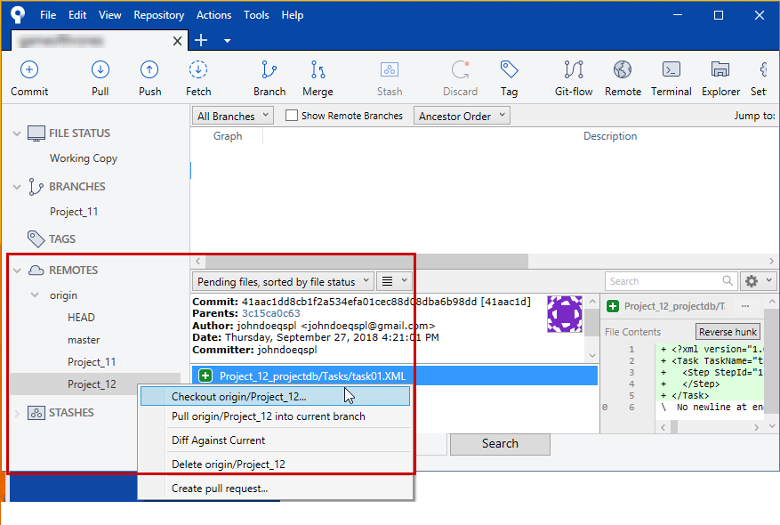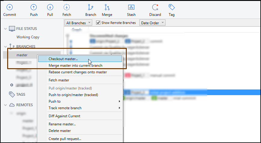 4. On the left hand side, expand Branches and then Checkout master branch.
