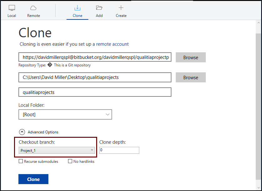 After the initial setup and SourceTree configuration, you can clone the Bitbucket repository and checkout Qualitia projects on your local system.