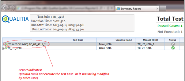 If any user is working on a test case or task while triggering the suite execution, Qualitia cannot access. Such test cases are not executed and are marked with Not Executed status in the suite execution report.