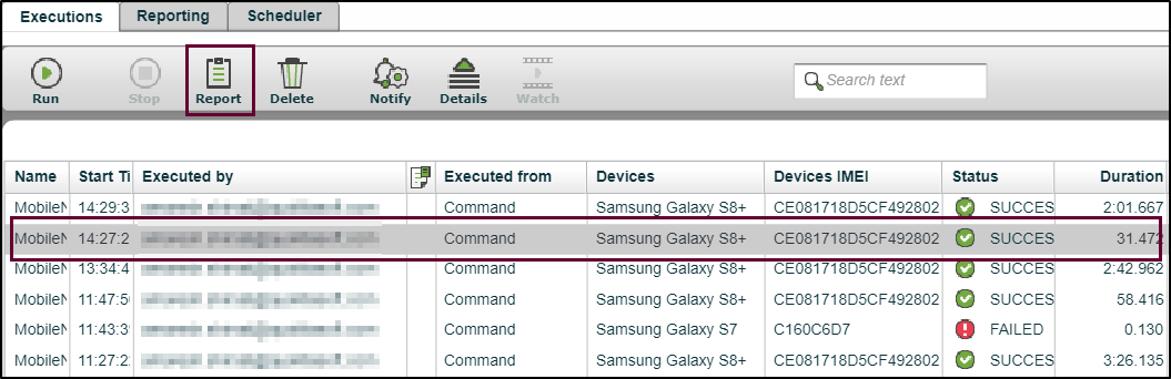 Once you have triggered the offline execution, you can view the status of your ongoing executions in Perfecto's Execution Center. Each test case appears on dashboard as a single grid with execution status against it. The status is updated after each test execution is completed in Perfecto's environment with its status (FAILED / SUCCESS) against it. Select the test case from the list and click Report from top to view recording of your test case.