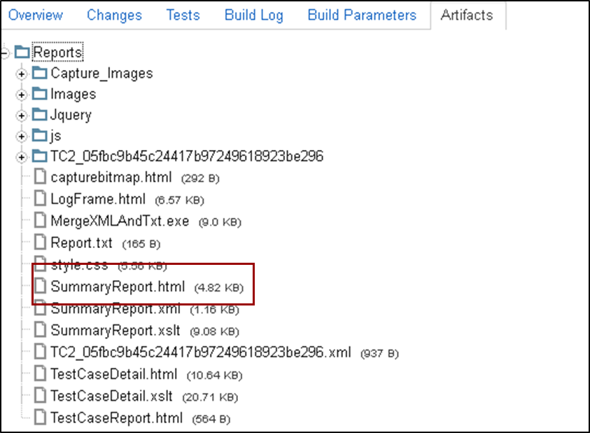 - In the Artifacts section, click the SummaryReport.html to view the report.