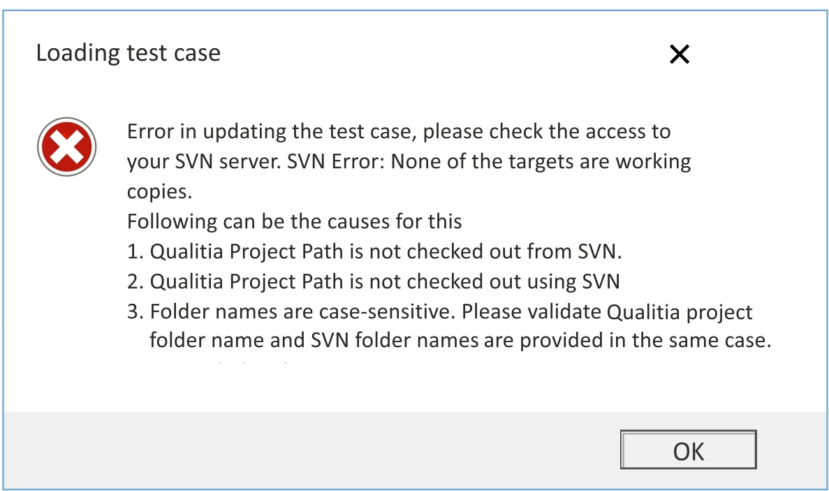 Error in Updating the test case, please check access to your SVN Server. SVN Error: None of the targets are working copies.