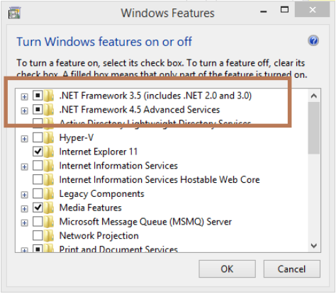 If the server machine has Windows 7 and above, navigate to Control Panel > Programs and Features > In the right pane, click Turn Windows features on or off.