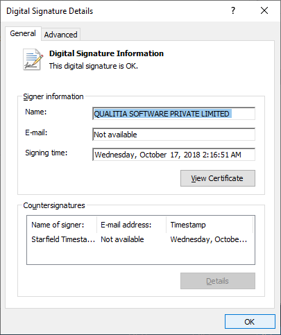 Qualitia digitally signs all the executable files shared with Qualitia Setup or installable. In case system fails to verify this Digital signature, it is recommended to verify the signature using few simple steps before continuing the operation.