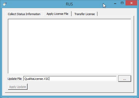 - In the RUS Tool, click the Apply License File tab and select the .V2C file which you have downloaded earlier.