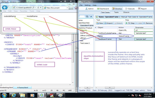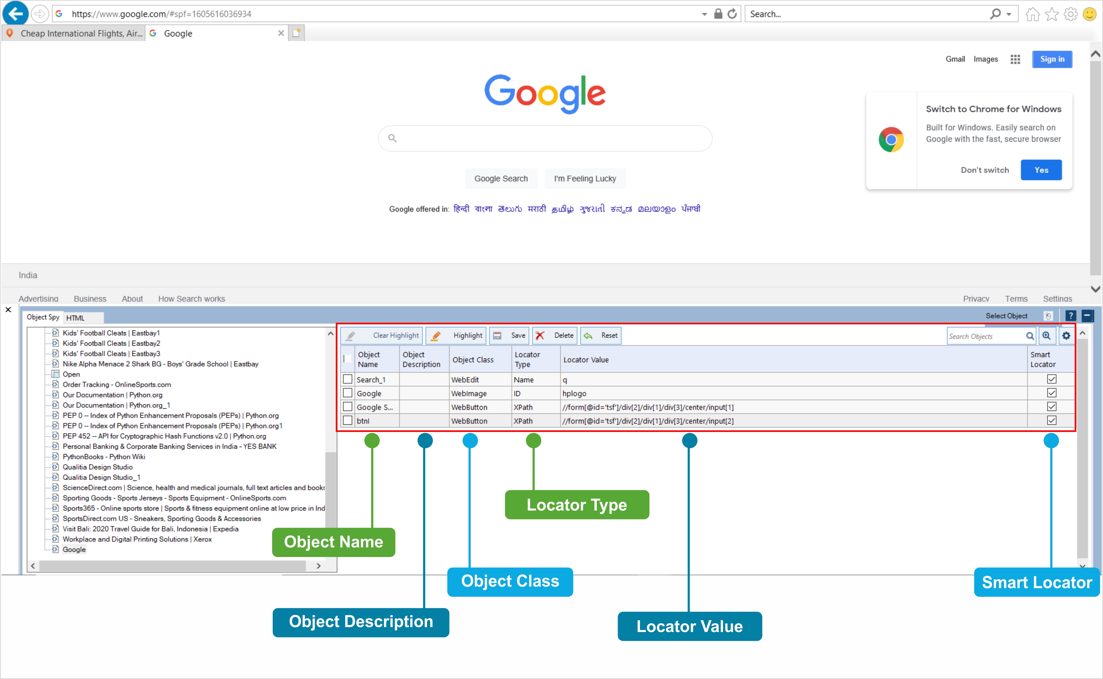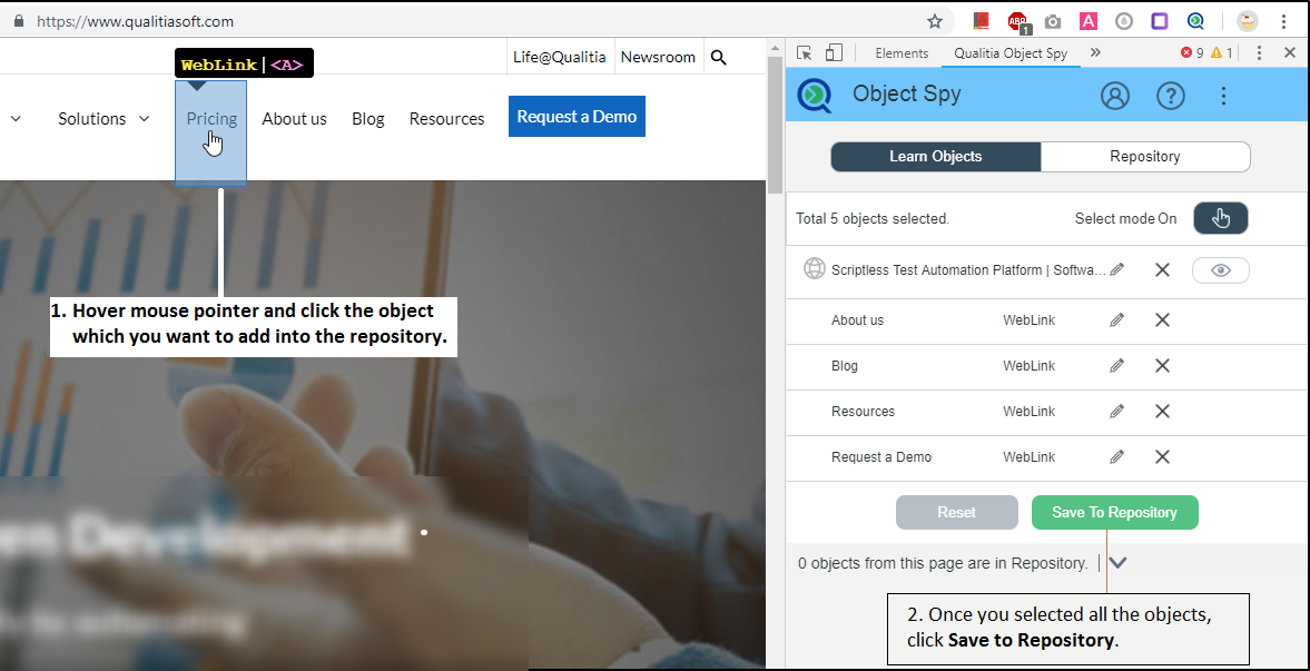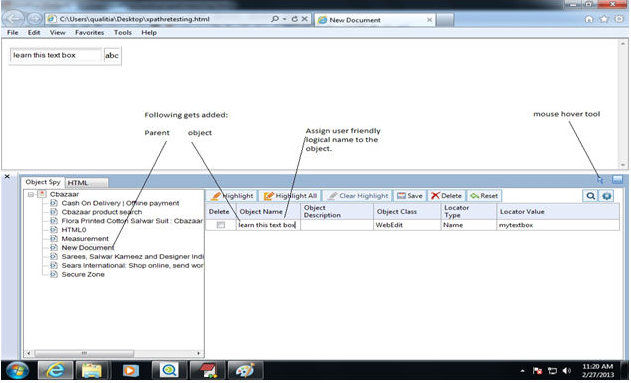 Qualitia Object Spy is an Internet Explorer plug-in embedded within IE window at the bottom of the page. It allows you to add objects in the repository for developing test cases or tasks. You can edit the objects if there are any changes to the document structure and at the same time validate changes to objects.