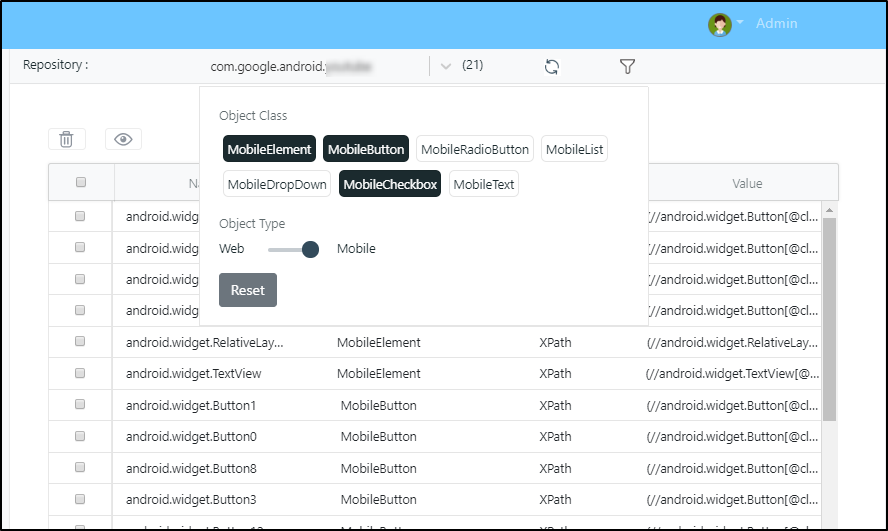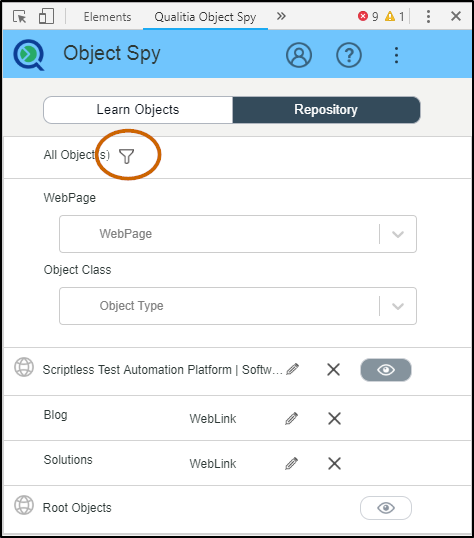 Qualitia gives you privilege to filter objects while working with the Object Spy.