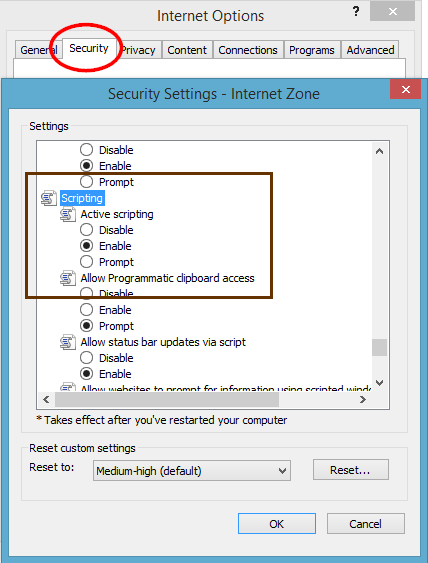Ensure that the Active scripting option is set to Enable under Security Settings section. To do so, under Internet Options > Security > Custom Level. By default, this option is set to Disable in the high security zone.