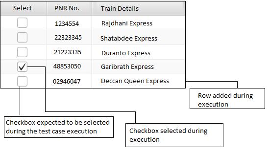During development of your test case, you will perform one reservation, the system will generate a new PNR (e.g. 123459), and the respective checkbox will be added as an object to select the corresponding PNR row. Each time you execute this test case, a new PNR is generated along with a new checkbox. This checkbox is generated dynamically and hence its properties are also be dynamic.