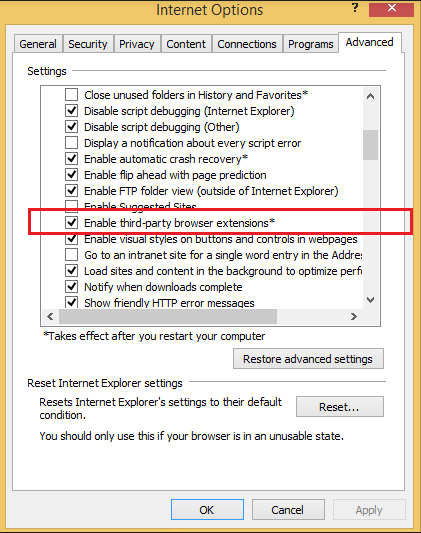 Ensure that Enable third-party browser extensions* is enabled from the Advanced section of Internet Options.