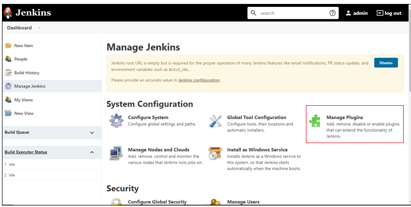 On the top left corner of the screen, click Jenkins > Manage Jenkins > Configure System.