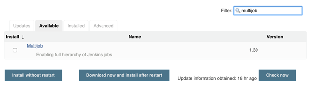 Click Download now and install after restart to automate the downloading of the MultiJob plugin, and installing it, and then restarting the Jenkins server.