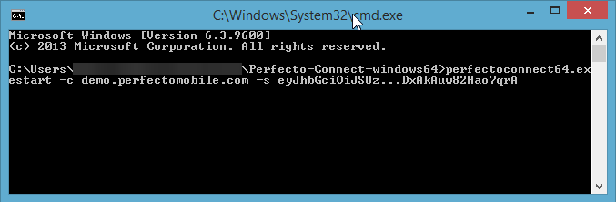 For example:CODEperfectoconnect.exe -c <Perfecto_Cloud_URL> -s <Security_token>