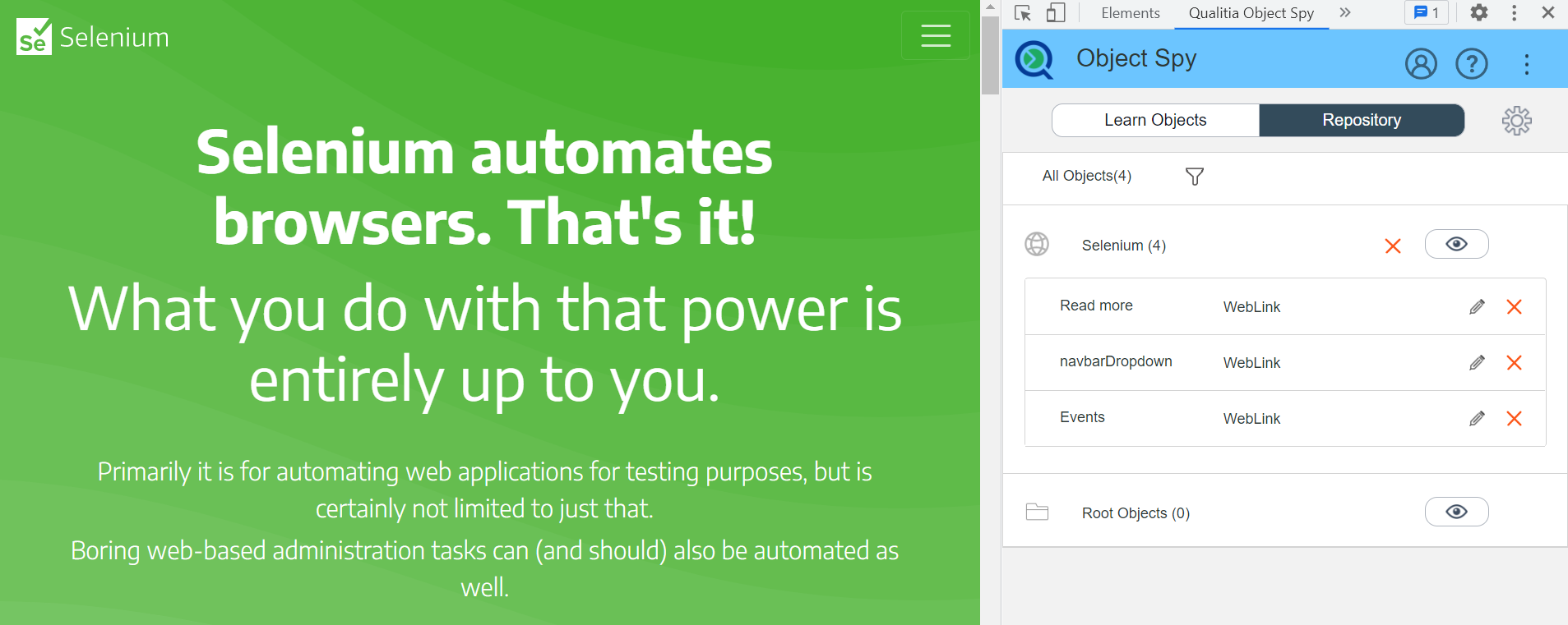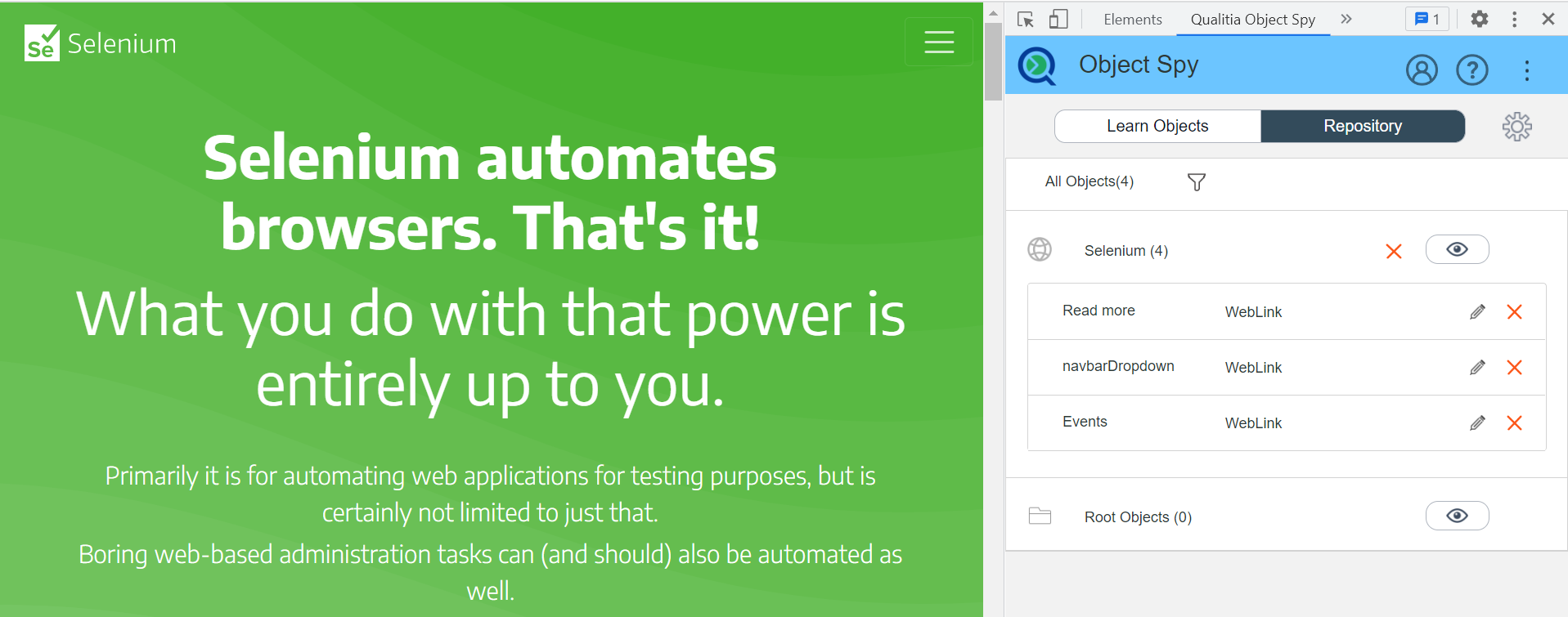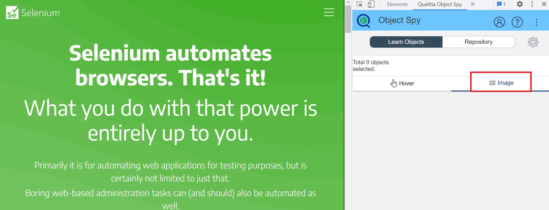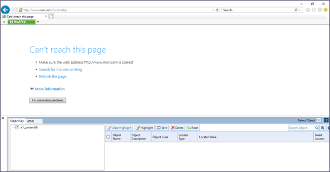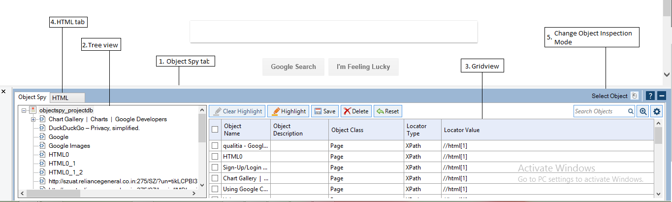 Qualitia Object Spy is an Internet Explorer plug-in embedded within IE window at the bottom of the page. It allows you to add objects in the repository for developing test cases or tasks. You can edit the objects if there are any changes to the document structure and at the same time validate changes to objects.