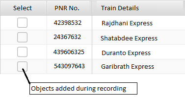 During development of your test case, you will perform one reservation, the system will generate a new PNR (e.g. 123459), and the respective checkbox will be added as an object to select the corresponding PNR row.Each time you execute this test case, a new PNR is generated along with a new checkbox. This checkbox is generated dynamically and hence its properties are also be dynamic.