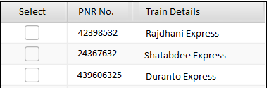The Online Railway Reservation System allows you to reserve tickets between two stations. After successful completion, it creates a PNR number and displays in the table as shown below along with a checkbox.